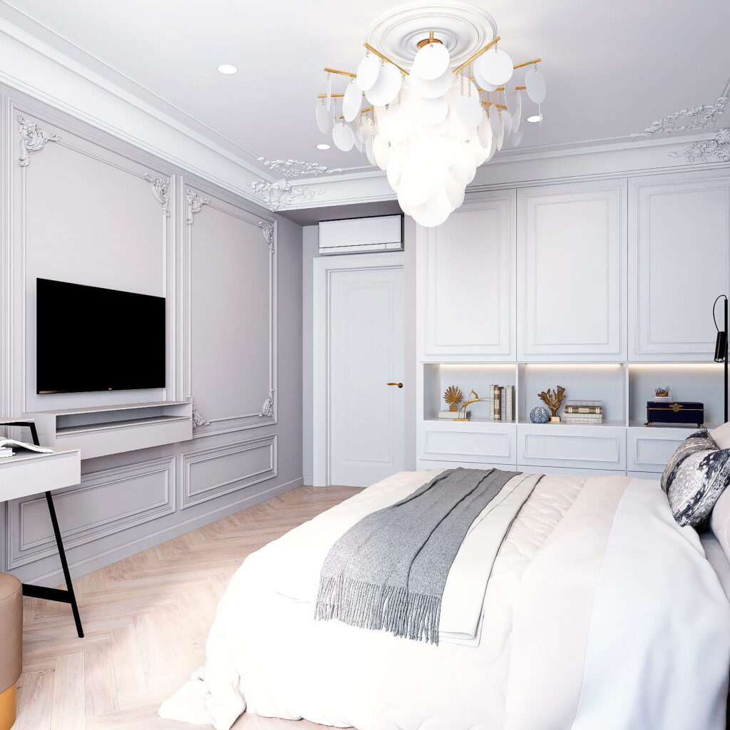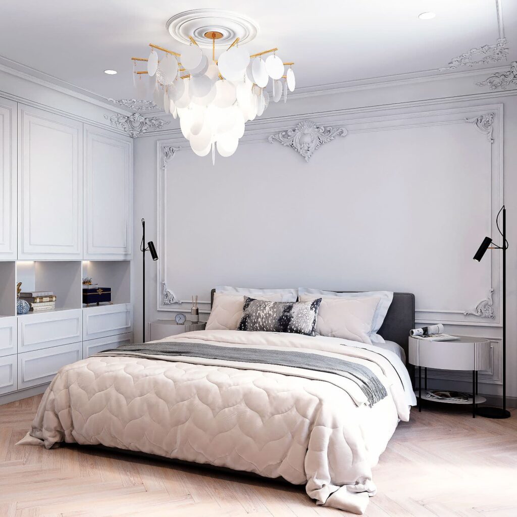 В спальне предусмотрена классическая отделка стен с богатой лепниной и современными светильниками.