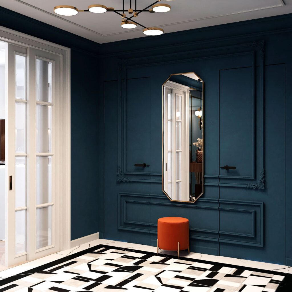 Оригинальная прихожая заметно отличается от стандартных интерьеров. Стены оклеены обоями под покраску, декорированы молдингами и окрашены в глубокий синий цвет. В сочетании с графичной плиткой выглядит очень стильно. Двери визуально скрыты.
