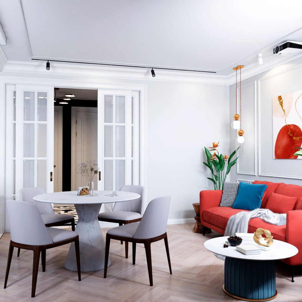Неоклассический интерьер с яркими акцентами. Интерьер создан с использованием светлых оттенков и дополнен насыщенными и яркими цветами.